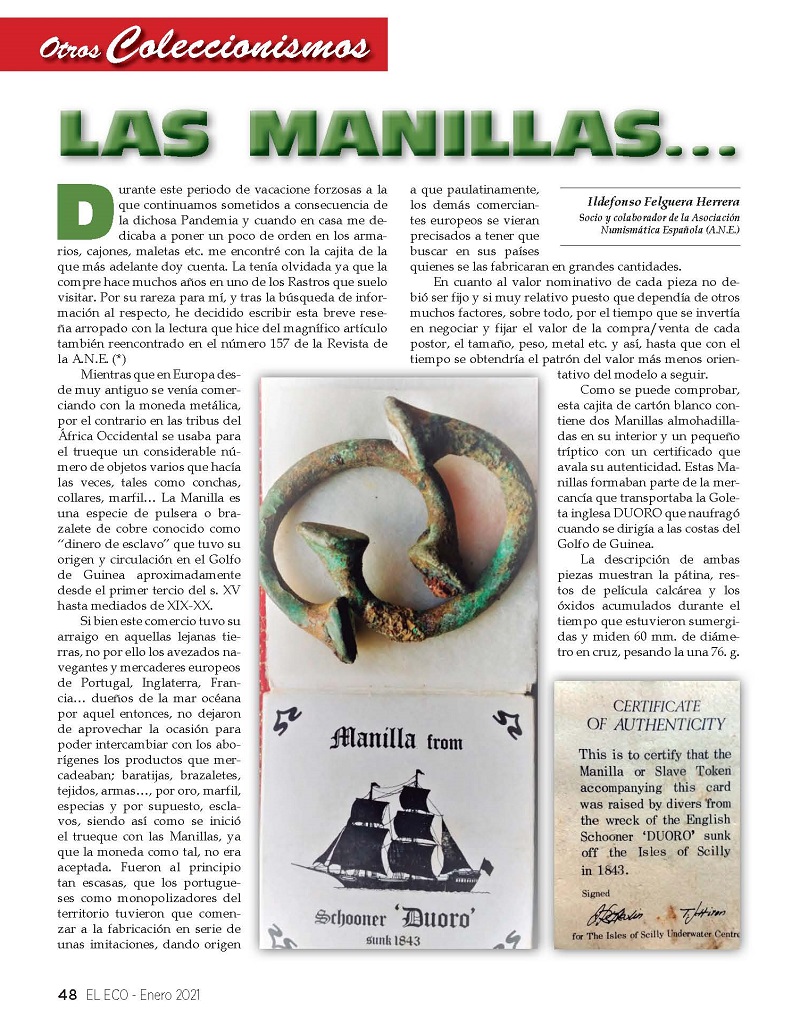 EL apartado de “Otras Colecciones” nos trae un curioso artículo sobre “Las Manillas” de Ildefonso Felguera Herrera, socio y colaborador de la Asociación Numismática Española (A.N.E.)