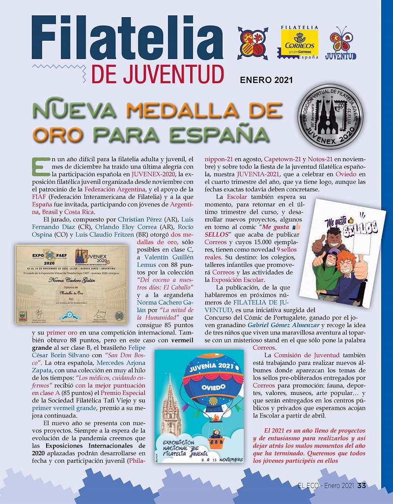 El Monográfico “Filatelia de Juventud”, dirigido por José Pedro Gómez-Agüero, vicepresidente de FESOFI, informa de una nueva medalla de oro para España. En un año difícil para la filatelia adulta y juvenil, el mes de diciembre ha traído una última alegría con la participación española en JUVENEX-2020, la exposición filatélica juvenil organizada desde noviembre con el patrocinio de la Federación Argentina, y el apoyo de la FIAF (Federación Interamericana de Filatelia) y a la que España fue invitada, participando con jóvenes de Argentina, Brasil y Costa Rica.