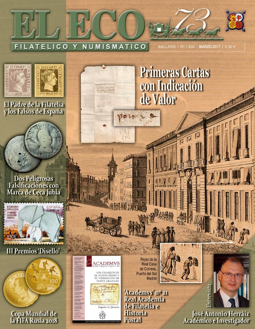 El número 1.260 de “EL ECO Filatélico y Numismático”, correspondiente al mes de Marzo de 2017, dedica su portada al artículo de Jesús Sitjà; como en cada número, Jesús Sitjà nos presenta un nuevo artículo de la sección “Los Primeros”, esta vez sobre ‘Primeras Cartas con Indicación de Valor’. Además, otros tres artículos inéditos, Fernando Aranaz del Rio, y ‘Motivos Españoles en la Filatelia Israelí Actual’. Joaquín Amado, en su sección Filatelia Fiscal, ‘Permisos y Licencias’, y por último Gerhard Lang-Valchs con ‘El Padre de la Filatelia y los Falsos de España’.